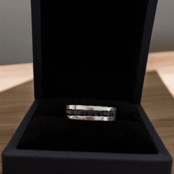 - Zircones : Deux rangs de zircones scintillantes ornent un côté de la bague, ajoutant une touche de glamour.